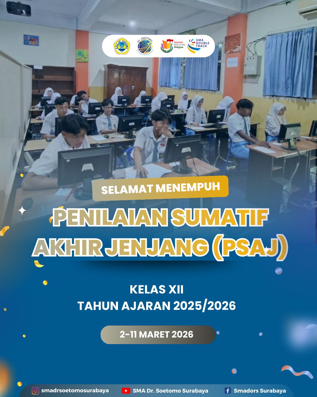 Penilaian Sumatif Akhir Jenjang (PSAJ) kelas XII SMA Dr. Soetomo dilaksanakan pada hari Senin, 2 Maret 2026 hingga Rabu, 11 Maret 2026. Kegiatan ini diikuti oleh seluruh peserta didik kelas XII sebagai bagian dari tahapan akhir evaluasi pembelajaran sebelum menyelesaikan pendidikan di jenjang SMA. Pelaksanaan PSAJ berlangsung secara tertib dan terjadwal, dengan pengawasan dari guru mata pelajaran serta panitia yang telah ditetapkan oleh sekolah.
